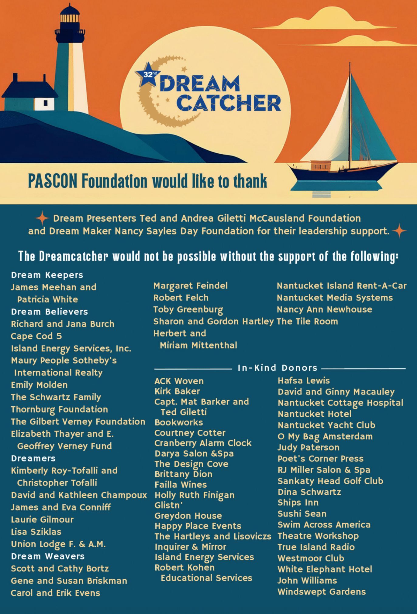Held each summer, Dreamcatcher brings together supporters, volunteers, and friends to honor the vital care PASCON provides and to ensure that patients and families on Nantucket continue to receive expert, compassionate support—always free of charge.